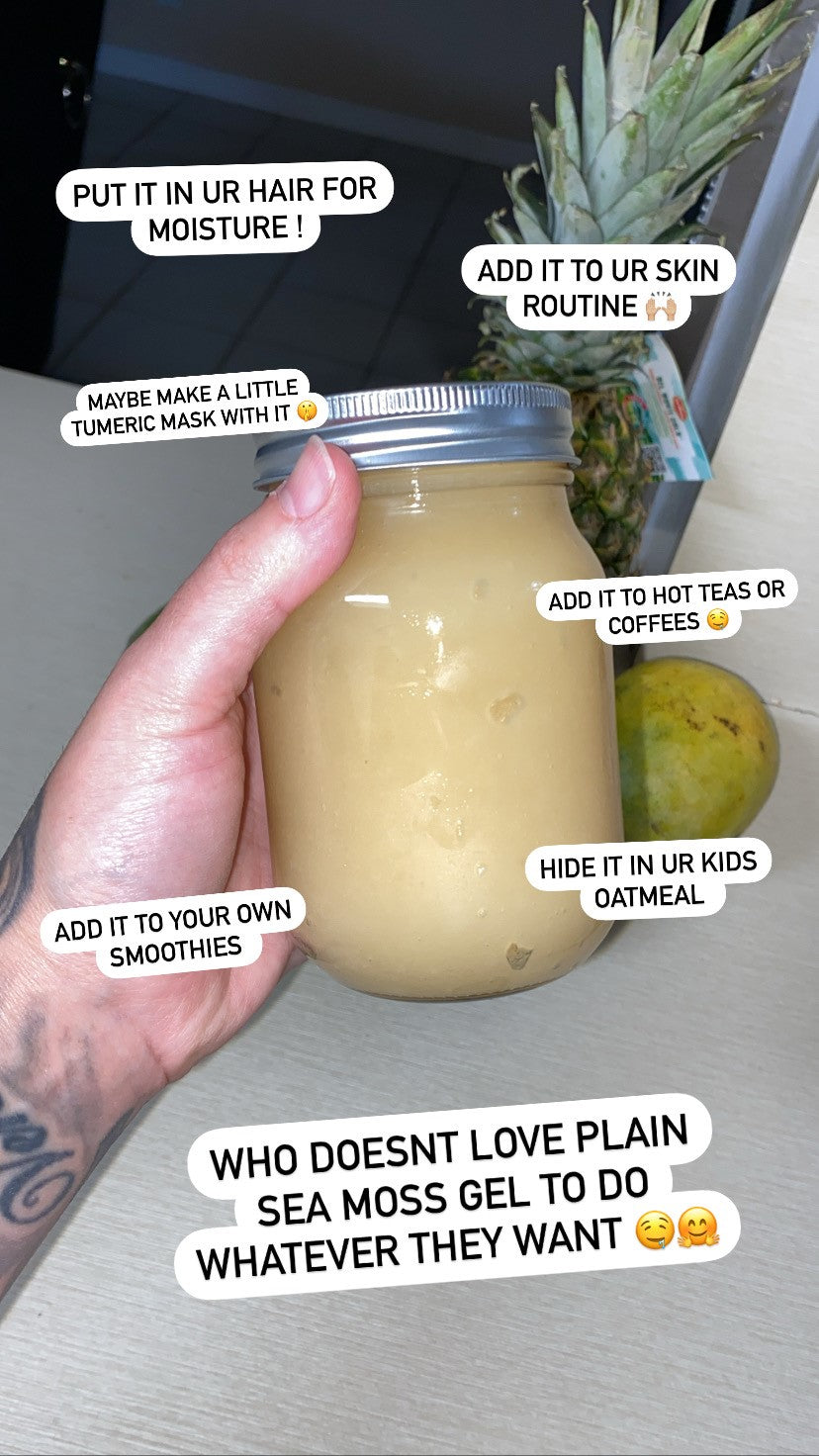 Our wildcrafted fresh sea moss jars offer you the vitamins and minerals you need daily by taking just two tablespoons per day in a natural and unprocessed way. Sea moss contains 92 of the 102 essential vitamins and minerals that our body needs on a daily basis to function such as Iron, Magnesium, Calcium, Potassium and Zinc. Plain gel can be added to your daily smoothies, hot teas/coffee's even oatmeal's !